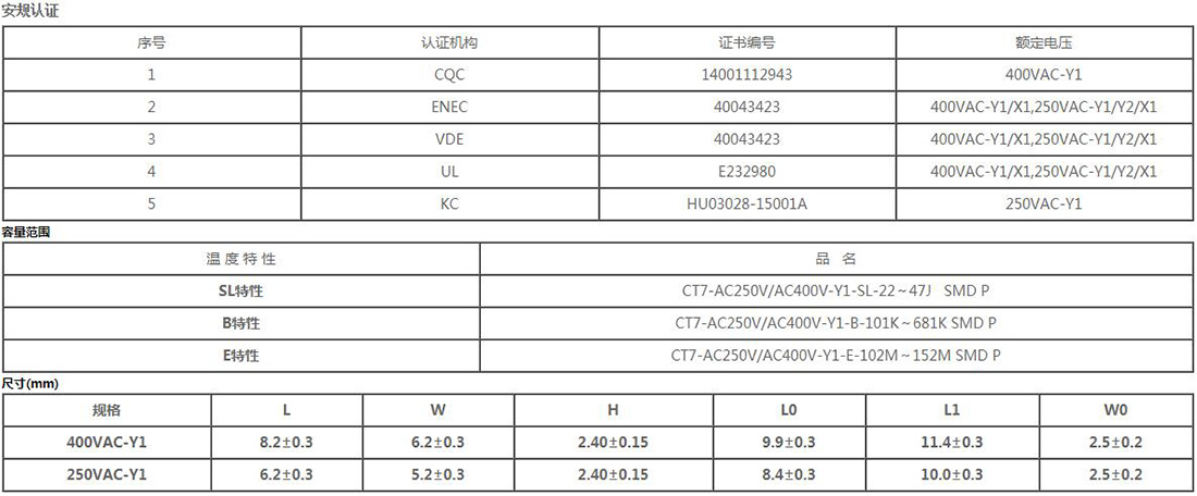- X1/Y1系列电容器取得UL/CQC/VDE/ENEC/KC等安全认证